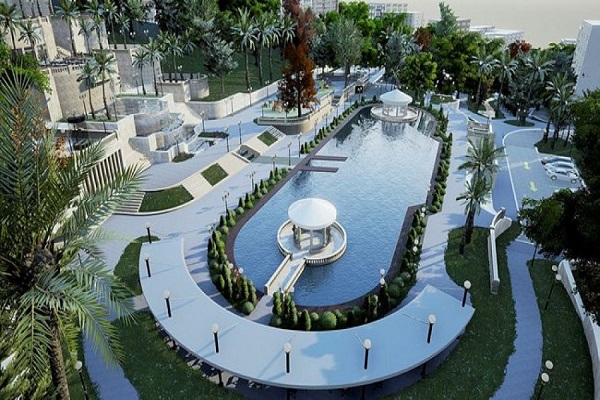 توجد ممرات للمشي ومسارح مفتوحة ضخمة وجسر ضخم فوق بركة اصطناعية.